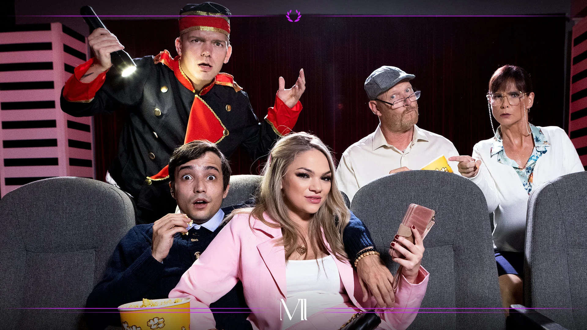 Athena pulls out her phone and starts chatting away with Ricky, showing a total lack of respect for the other people in the theatre. Syren isn’t shy to give her a piece of her mind, and she promptly tells Athena to keep quiet. Athena scoffs, begrudgingly putting her phone away while trying her hardest to find some sense of enjoyment in the boring movie in front of her. But then she gets a sneaky idea. She lifts the divider between her and Ricky and starts rubbing his crotch through his pants. She then pulls open his zipper and takes his cock out and starts jerking him off. Syren and Dick can see everything, and they are incensed. Syren demands that Athena and Ricky change their behavior, but it’s clear that these teens aren’t going to listen.