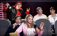 Athena pulls out her phone and starts chatting away with Ricky, showing a total lack of respect for the other people in the theatre. Syren isn’t shy to give her a piece of her mind, and she promptly tells Athena to keep quiet. Athena scoffs, begrudgingly putting her phone away while trying her hardest to find some sense of enjoyment in the boring movie in front of her. But then she gets a sneaky idea. She lifts the divider between her and Ricky and starts rubbing his crotch through his pants. She then pulls open his zipper and takes his cock out and starts jerking him off. Syren and Dick can see everything, and they are incensed. Syren demands that Athena and Ricky change their behavior, but it’s clear that these teens aren’t going to listen.