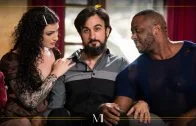 They all get undressed, with Mason taking turns kissing and fondling the other two’s asses as they disrobe. Micah and Lydia give Mason a double blowjob while he sits back on the couch, moaning with delight. Mason then eats out Lydia’s pussy as she lies back into Micah’s arms and strokes his cock. Mason then moves over to suck on Micah’s cock while Lydia masturbates on his other side, whispering naughty nothings into his ear. Lydia lies back onto the couch and Mason fucks her in missionary while Micah facefucks him at the same time.