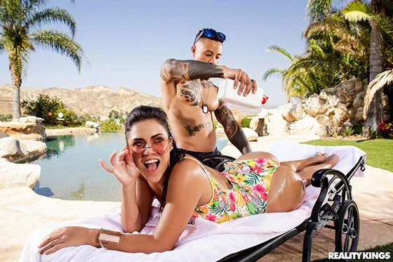 Monica Sage is here to splash and play in the bright sun, letting her curves do all the talking. In a bright floral swimsuit and cute accessories, Monica is the embodiment of a poolside pawg. But don’t let the innocent outfit fool you! Monica gags and slobbers on cock like the best of them, drool running down her chin as she sucks and strokes, eager to milk out the delicious cum. Our stunt cock plays with her pussy for a while before moving onto the main event… Monica begs him to “use that hole” as he slides into her tight asshole, getting Monica to shout in pleasure, moaning for more – harder, deeper, faster!